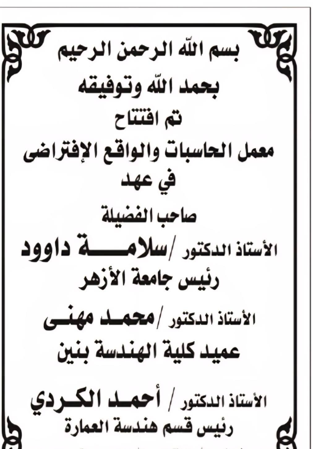 في إطار التطوير المستمر ومواكبة مستجدات العصر الذي تشهده جامعة الأزهر في جميع المجالات؛ قام فضيلة الدكتور سلامة جمعة داود، رئيس جامعة الأزهر، والدكتور محمد مهنى، عميد كلية الهندسة للبنين بالقاهرة، والدكتور أيمن مصيلحي عميد الكلية السابق ، والدكتور محمد سعد، وكيل الكلية لشئون التعليم والطلاب، والدكتور أحمد القاضي، وكيل الكلية للدراسات العليا والبحوث، بافتتاح معمل الحاسبات والواقع الافتراضي بكلية الهندسة للبنين بالقاهرة التابع لقسم هندسة العمارة برئاسة الدكتور أحمد الكردي، رئيس قسم هندسة العمارة.